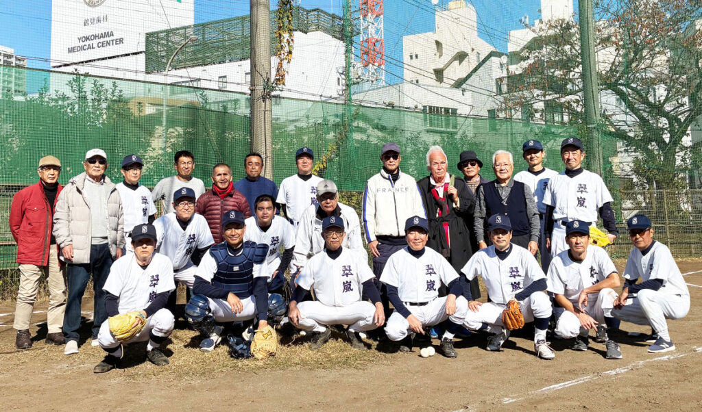 好天に恵まれた当日、平沼高校野球部OBOG会前会長・早福久雄氏(高校12回)の始球式で9時30分プレーボール。先攻の翠嵐OBチームは走者を出すものの3回まで無得点。一方、こちらの先発、選手団最年長の小嶋投手(高校29回)は、歯科医院を午前中休診にした甲斐もあり、2回を無安打無失点に抑える好投。この間高橋捕手(高校33回)は平沼走者の2盗を自慢の強肩で阻止!二番手山本投手(高校43回)も横手からのスライダーを武器に相手打線を翻弄、3回に右前タイムリーで2点を献上するも、2併殺で締めてくれました。