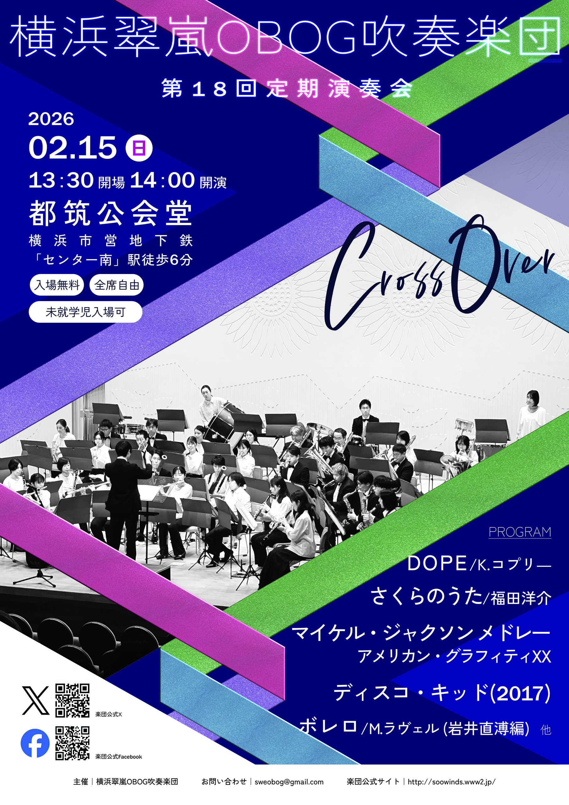 今回は「Cross Over」をテーマに、様々なジャンルの音楽を吹奏楽というフォーマットで幅広い年代の方に楽しんでいただけるようなプログラムをご用意しました。